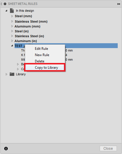 For folks that don t have a ton of experience with sheet metal properties the rules will be a simple way to get started. Fusion 360 comes with a default library of sheetmetal rules. Steel mm stainless steel mm aluminium mm steel in stainless steel in aluminium in are missing from the library in the dialog box sheet metal rules in sheet metal workspace. Edit sheet metal rules.